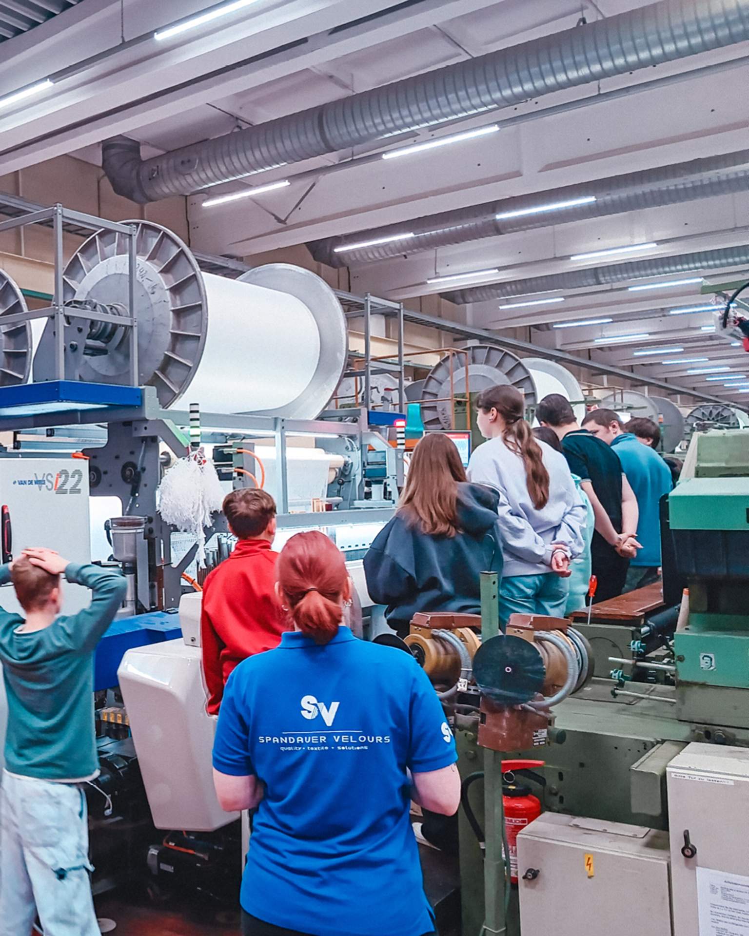 Ein erfahrener Mitarbeiter von Spandauer Velours zeigt einem Jugendlichen die Arbeit an einer Industriemaschine während der Woche der offenen Unternehmen Sachsen „SCHAU REIN!“. Text: Das war SCHAU REIN!